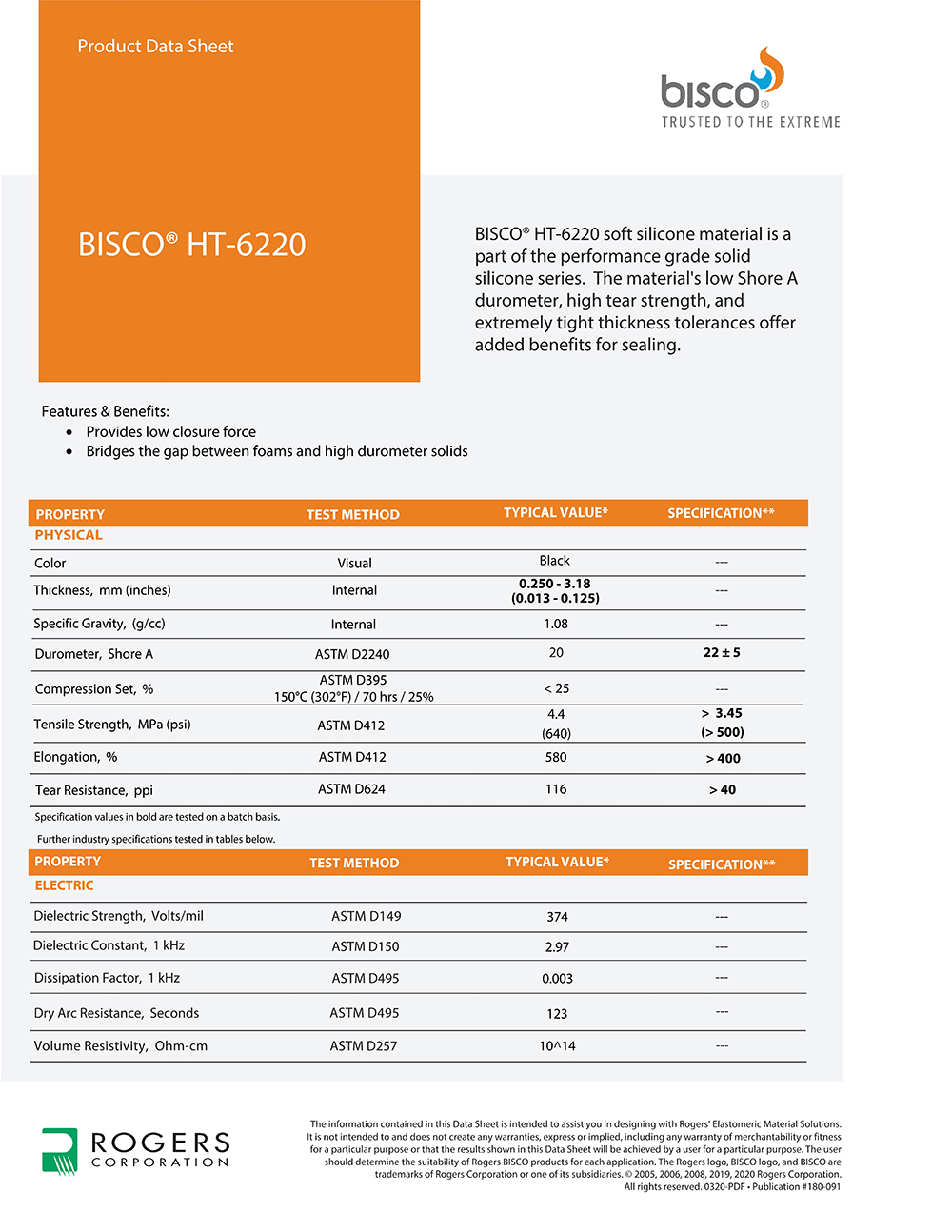 羅杰斯BISCO? HT-6220-20 實心硅膠