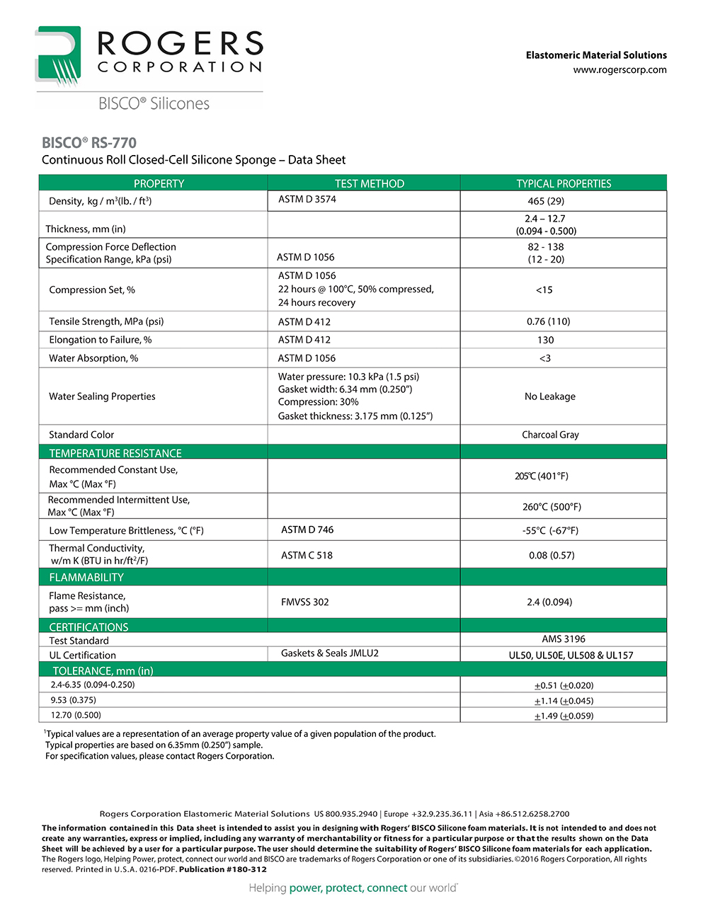 羅杰斯BISCO? RS-770 工業硅膠海綿